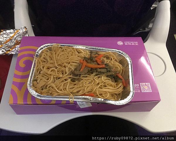 有提供牛肉麵跟雞肉飯,兩種機上餐,還附贈一個餐盒