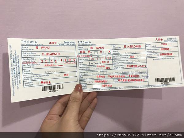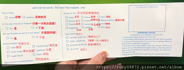 填妥入出境表格(Immigration Card-T.M.6)-------->俗稱的泰國出入境卡(ED卡)