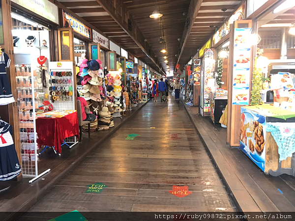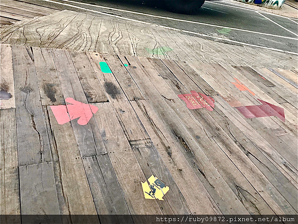地板會有紅色跟綠色的箭頭,分別為順時鐘跟逆時鐘繞著四方水上市場走一圈