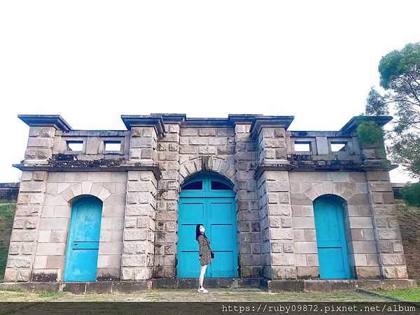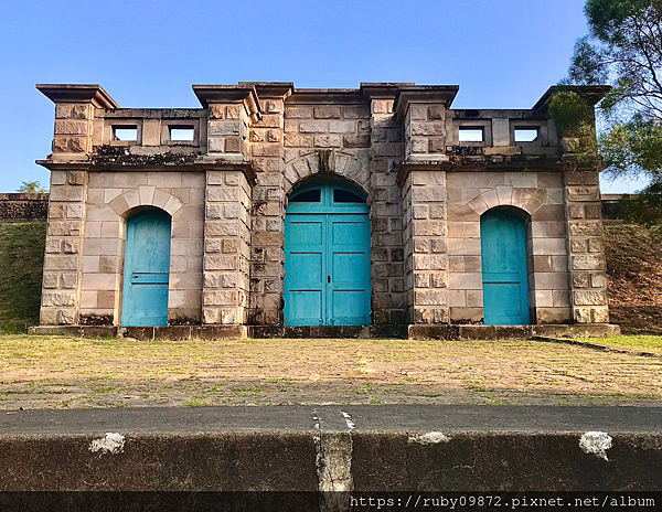 外觀為天然石材與仿石塊兩種組合而成之灰色建物,形制固若碉堡。