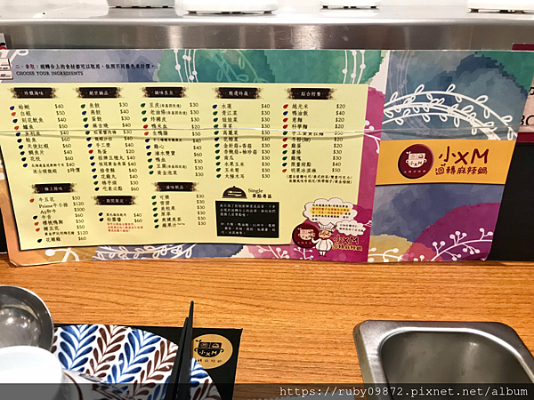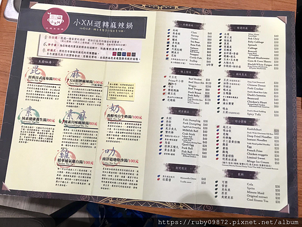 先選湯底,有日式昆布、雞湯、素食養生鍋、素食麻辣鍋、XM招牌麻辣鍋、牛奶鍋、南洋叻沙,每種價錢都不同
