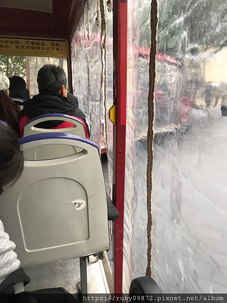 天氣真的很冷,園區電瓶車很貼心有在電瓶車外放個塑膠罩子,挺暖和的